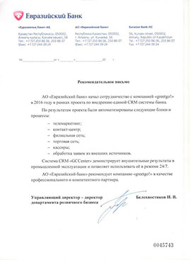 АО «Евразийский банк» рекомендует компанию «greetgo!» в качестве профессионального и компетентного партнера.